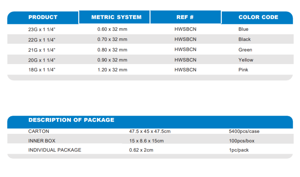 Size: 23G x 1 1/4” (0.60x20mm, Blue), 22G x 1 1/4” (0.70x20mm, Black), 21G x 1 1/4” (0.80x20mm, Green), 20G x 1 1/4” (0.90x20mm, Yellow), 18G x 1 1/4” (1.20x20mm, Pink)