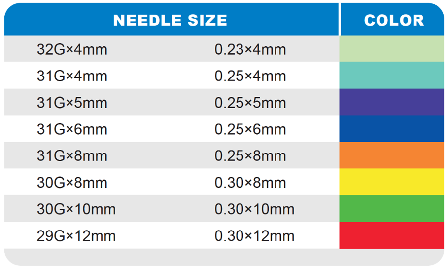 The needles are fit for Humapen (Eli Lilly, USA), Novopen III (Novo Nordisk, Denmark) and Dongbaopen (Dongbao, China)